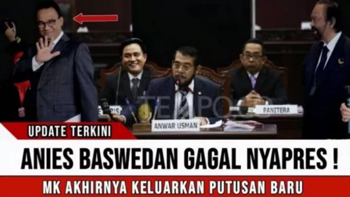Terkini.id, Jakarta - Beredar konten video yang menyebut calon presiden atau Capres dari Partai NasDem, Anies Baswedan gagal nyapres usai Mahkamah Konstitusi (MK) mengeluarkan keputusan baru.