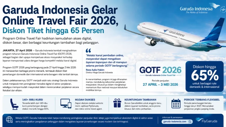 Terkini, Jakarta – Garuda Indonesia kembali menghadirkan program tahunan Garuda Indonesia Online Travel Fair (GOTF) 2026 sebagai bagian dari upaya memperluas akses masyarakat terhadap layanan transportasi udara dengan harga kompetitif melalui kanal digital.
