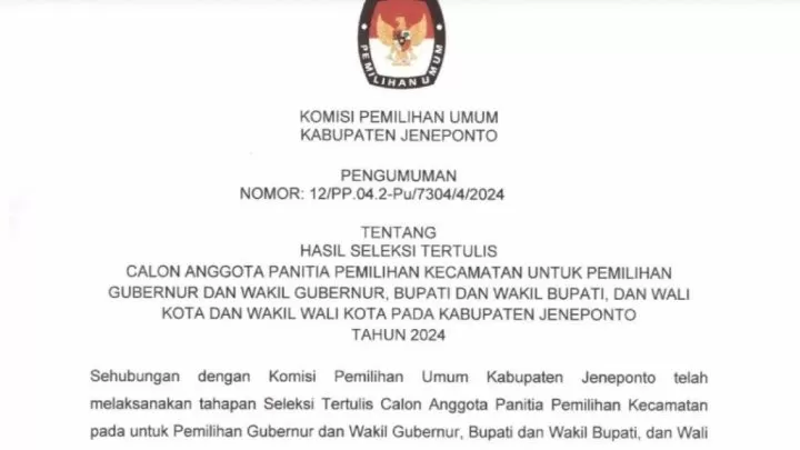 Pengumuman itu tertuang dalam pengumuman KPU Jeneponto nomor 12/PP.04 2-Pu/7304/4/2024 tertanggal 9 Mei 2024.
