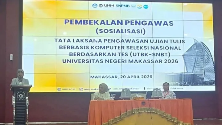 Terkini, Makassar — Pelaksana Tugas (Plt) Rektor Universitas Negeri Makassar, Prof. Dr. Farida Pattintingi, S.H., M.Hum., secara resmi membuka kegiatan pembekalan pengawas Tatalaksana UTBK-SNBT Lokasi 712 UNM Tahun 2026. Kegiatan tersebut digelar di Ballroom Menara Pinisi UNM, Senin (20/4).