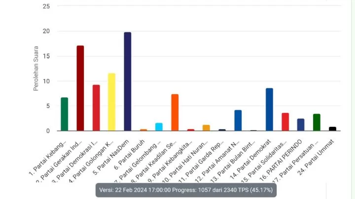 NasDem saat berita ini diterbitkan memperoleh 30.388 suara. Sedangkan Gerindra 26.297 suara.