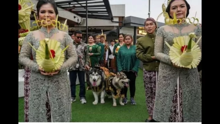 Dimana dalam acara pesta mewah menghabiskan anggaran hingga Rp 200 juta yang Layaknya acara pernikahan manusia, kedua anjing ini didandani dengan pakaian adat Jawa.