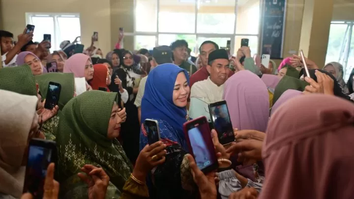 Disambut lantunan selawat puluhan santri Pondok Modern Nurul Asafa, Fatmawati langsung dikerumuni para jemaah yang antusias mengabadikan momen bersama dengan ponsel.