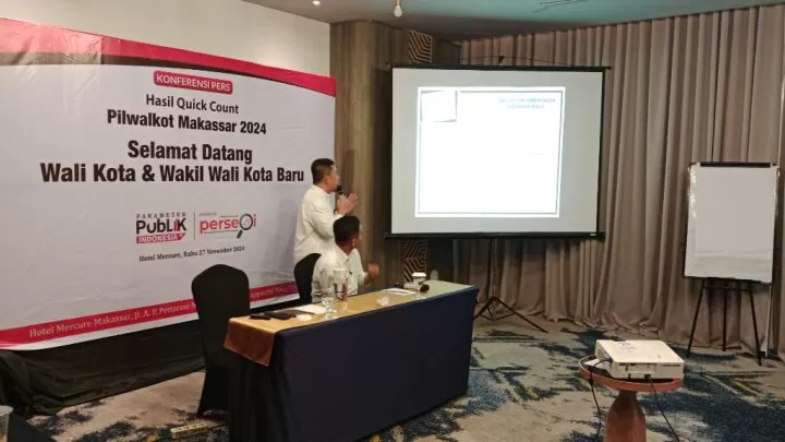 Terkini, Makassar - Lembaga survei Parameter Publik Indonesia (PPI) merilis hasil perhitungan cepat (Quick Count) untuk Pilwalkot Makassar 2024, di Hotel Mercure, Jalan AP Pettarani, Rabu 27 November 2024.