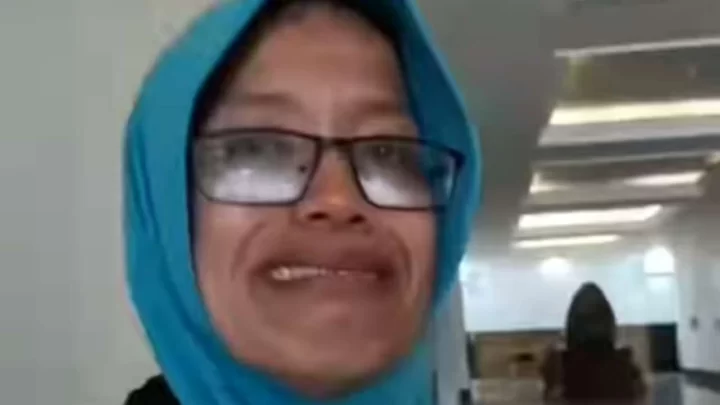Dilihat dari video tersebut, nampak seorang wanita paruh baya mengenakan kacamata dan jilbab biru sedang menggendong anaknya yang masih berusia balita.